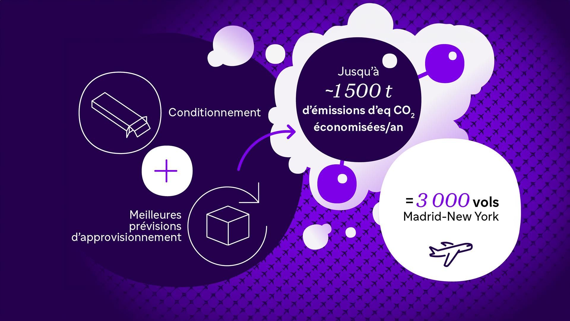 Selon leur analyse, une meilleure estimation et un meilleur échéancier des commandes de vaccins passées par les autorités à un fabricant comme Sanofi permettraient d’éviter de gaspiller 800 000 vaccins par an.1 L’optimisation des emballages réduirait encore plus les volumes de déchets ainsi que l’espace de transport et de réfrigération nécessaire aux vaccins au sein de la chaîne d’approvisionnement. En agissant sur ces deux leviers, nous pourrions, seulement avec les vaccins Sanofi, réduire les émissions de CO2 de près de 1 500 tonnes par an !2 Soit l’équivalent de près de 3 000 vols Madrid-New York par an.1