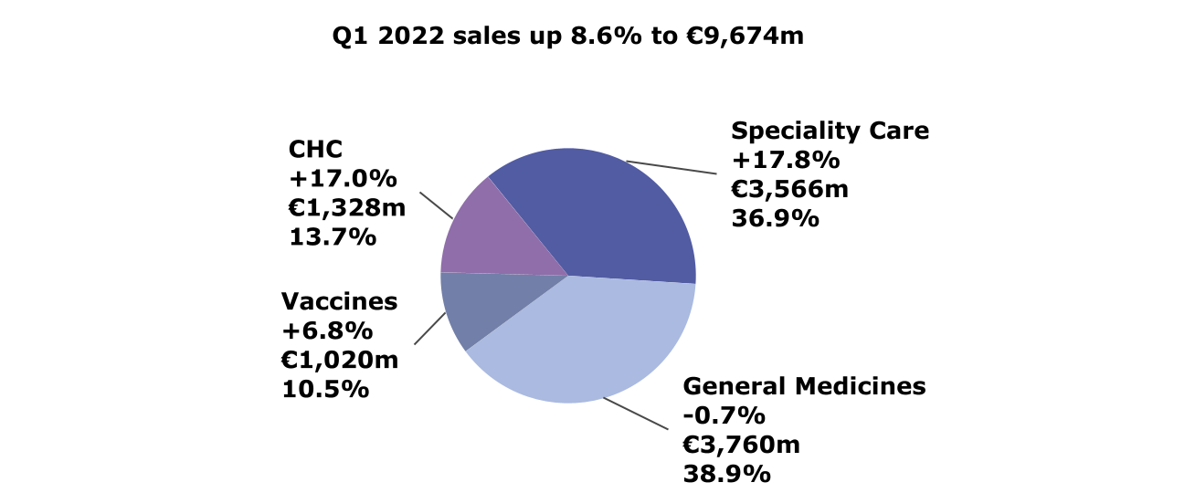 First-quarter 2022 Pharmaceutical sales increased 7.5% to €7,326 million, mainly driven by the Specialty Care portfolio (up 17.8%) with continued strong performance of Dupixent® while sales in General Medicines decreased 0.7%.