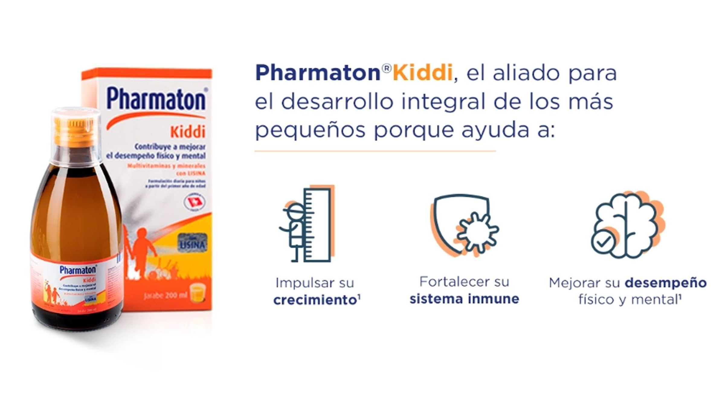 Pharmaton® Kiddi multivitamínico con minerales y Lisina. Niños de 1 a 5 años: 7.5 ml al día. Escolares adolescentes y adultos: 15 ml al día. Registro Sanitario: 363451212. Si los síntomas persisten consulte a su médico. Manténgase fuera del alcance de los niños.