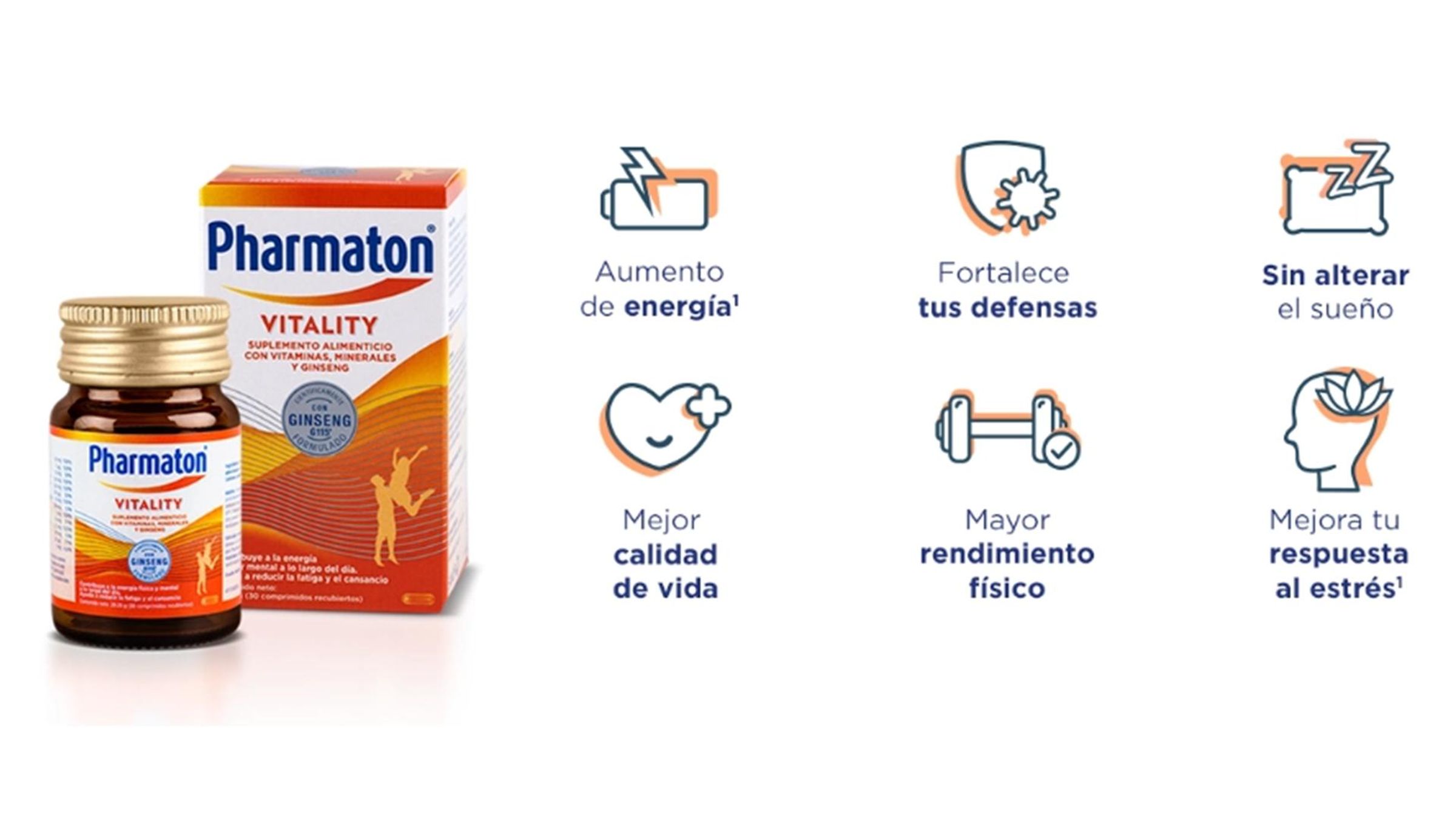 Pharmaton® Vitality Suplemento Alimenticio con vitaminas minerales y Ginseng G115® Notificación Sanitaria: 10345-ALE-0519. Este producto no es un medicamento y por sí solo no cubre los requerimientos nutricionales del individuo, por lo que su consumo es responsabilidad de quien lo recomienda o ingiere. Manténgase fuera del alcance de los niños.