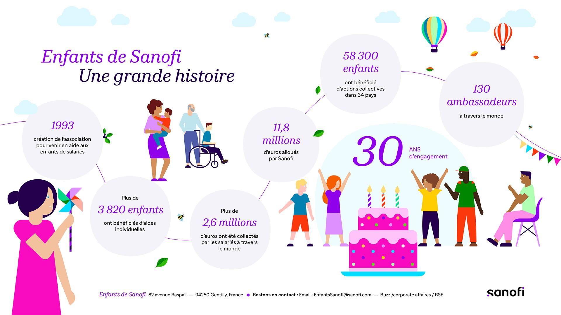 Aujourd'hui, Enfants de Sanofi célèbre 30 années d'engagement collectif. Grâce au soutien de Sanofi et à la générosité de ses salariés, l'association continue d'inspirer et de changer des vies. L’association est financée à la fois par l’entreprise et par les dons des salariés dans le monde. La dotation de Sanofi en 2023 est de 600 000 euros et les dons des salariés s’élèvent à 50 000 euros avec des opérations de collectes de dons menées dans 11 pays.