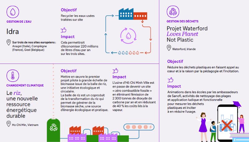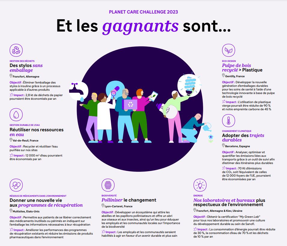 Sur les 161 idées innovantes proposées pour réduire l’empreinte environnementale de Sanofi, celles de trois équipes – de France, Belgique et Italie, du Vietnam et d’Irlande voient leurs projets financés et mis en œuvre sur les sites de Sanofi, avec pour objectif de répliquer ces projets pilotes sur l’ensemble des sites de l’entreprise.