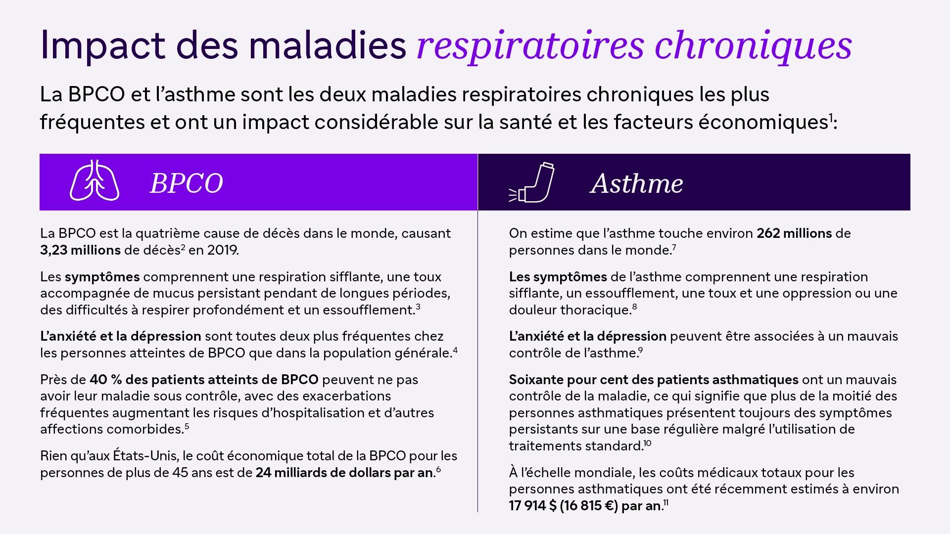 Le traitement des maladies respiratoires s’est amélioré au cours des 50 dernières années, mais malgré les progrès réalisés, y compris le développement de traitements biologiques, il continue d’y avoir des besoins non satisfaits considérables et des défis considérables qui n’ont pas été résolus.1 C’est pourquoi Sanofi s’engage à tirer parti de son expertise en immunoscience et à travailler pour proposer de nouveaux traitements révolutionnaires pour les maladies respiratoires.