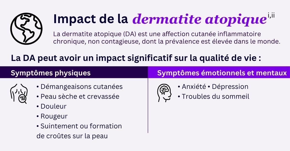 « En tant que pédiatre et père d’un enfant atteint de DA, j’ai vécu de première main l’effet que cette maladie peut avoir sur un patient et sa famille. Imaginez avoir une éruption cutanée sur tout le corps qui ne disparaît pas, ne pas pouvoir dormir la nuit à cause de démangeaisons sévères ou se réveiller chaque matin avec du sang sur votre pyjama et vos draps à cause des grattages. Cela prend un vrai tribut sur votre vie.1 »