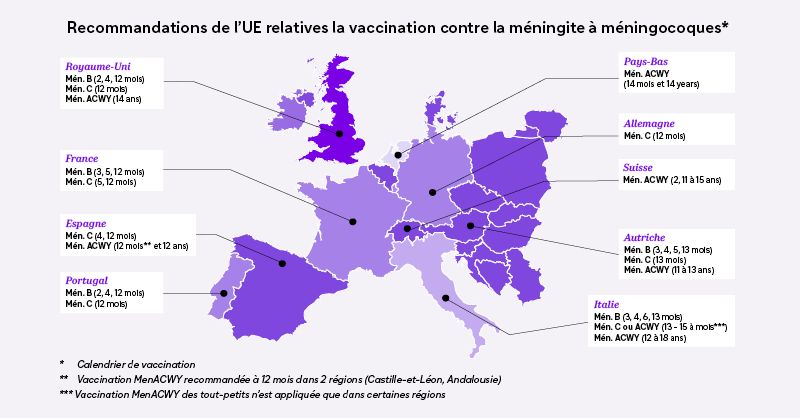 - Centre européen de prévention et de contrôle des maladies (ECDC), 2022. Vaccine Scheduler. Meningococcal disease, recommended vaccinations. Disponible à l’adresse suivante : https://vaccine-schedule.ecdc.europa.eu/Scheduler/ByDisease?SelectedDiseaseld=48&SelectedCountryldByDisease=-1