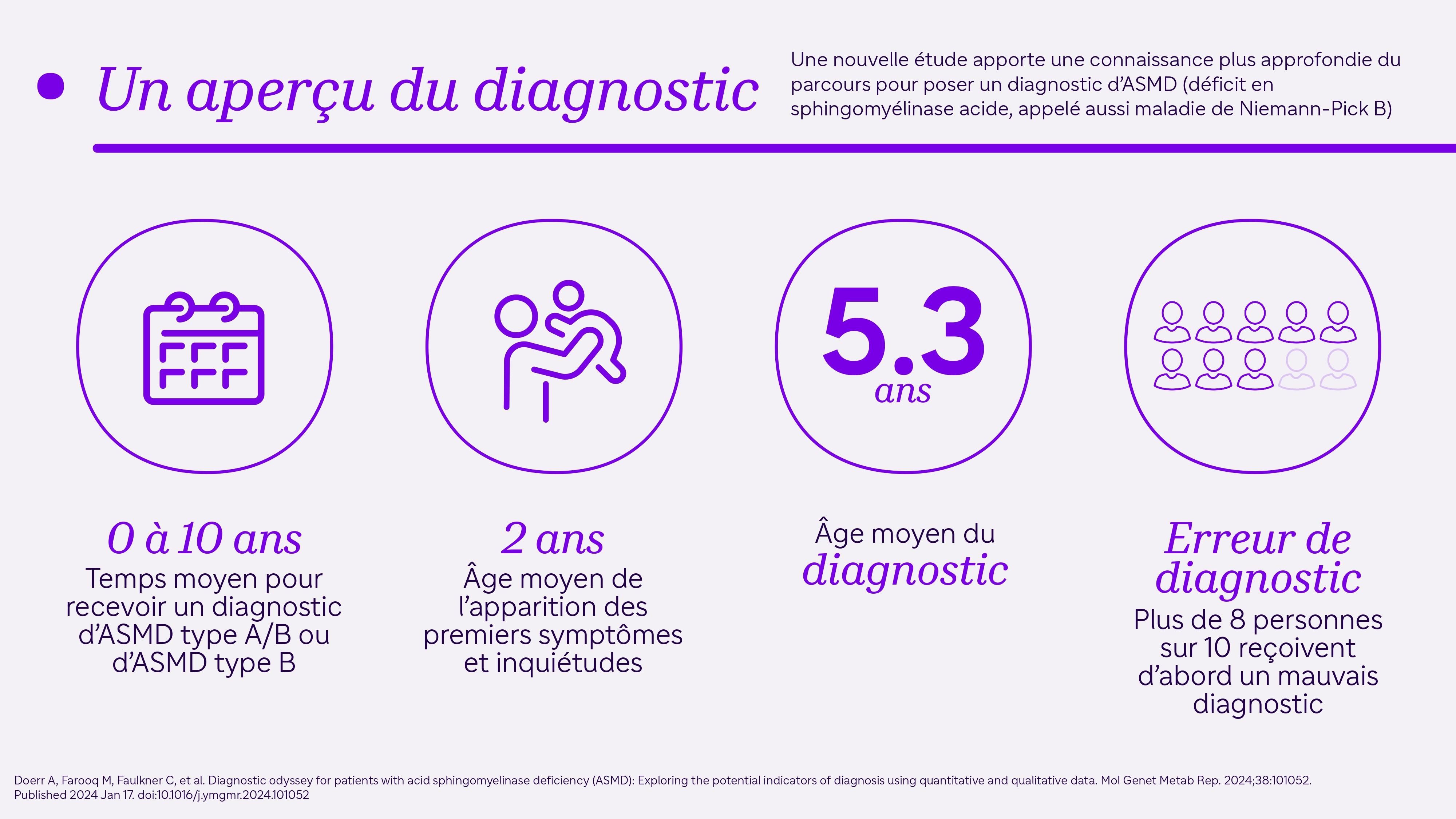 Le déficit en sphingomyélinase acide est si rare que de nombreux médecins peuvent ne jamais rencontrer une personne atteinte de cette maladie, ce qui fait que la communauté médicale est beaucoup moins familiarisée avec le déficit en sphingomyélinase acide qu’avec d’autres maladies. Une personne atteinte de déficit en sphingomyélinase acide peut consulter jusqu’à sept spécialistes, voire plus, avant de connaître le nom de la maladie dont elle est atteinte.