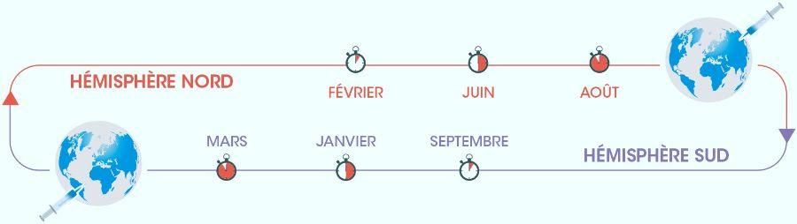 Le temps entre la fabrication d’un vaccin et sa livraison est d’environ 2 ans mais pour le vaccin contre la grippe tout doit aller très vite, quelques mois à peine entre l’identification des souches virales circulantes et la mise à disposition du vaccin dans les officines. Pour l’hémisphère Nord, le compte à rebours débute en Février, dès réception des recommandations de l’Organisation Mondiale de la Santé (OMS). Les équipes sont alors à pied d’œuvre pour relever un défi sans cesse renouvelé avec, en Septembre, la course qui commencera pour l’hémisphère Sud.