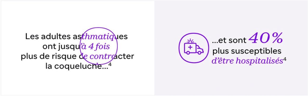 Les conséquences néfastes de la coqueluche sont exponentielles chez les adultes asthmatiques, qui ont jusqu’à 4 fois plus de risque d’être infectés que les adultes sans comorbidités.4 Les personnes asthmatiques qui contractent la coqueluche sont également 40% plus susceptibles d’être hospitalisées que les autres.4
