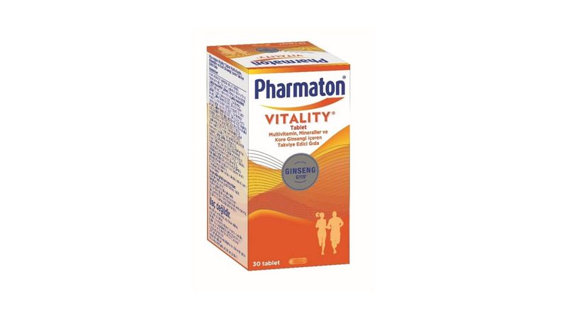 Pharmaton® Vitality®, etkinliği klinik olarak kanıtlanmış Ginseng G115®, 12 vitamin, 6 mineral içeren Takviye Edici Gıdadır. Pharmaton® Vitality®’nin içeriğinde bulunan Ginseng G115®’in etkinliği birçok klinik çalışmalarla kanıtlanmıştır. Pharmaton® Vitality® Tablet içeriğindeki C, B1, B2, B3, B5, B6, B12 vitaminleri ve Biotin, Demir, Magnezyum, Manganez, Bakır normal enerji oluşum metabolizmasına katkıda bulunur. İçeriğindeki B2, B3, B6, B12, C vitaminleri ve Folik Asit, Demir yorgunluk ve bitkinliğin azalmasına katkıda bulunur. İçeriğinde bulunan A, B6, B12, C, D vitaminleri ve Demir, Çinko, Bakır, Selenyum, bağışıklık sisteminin normal fonksiyonuna katkıda bulunur. Günlük kullanıma uygundur.