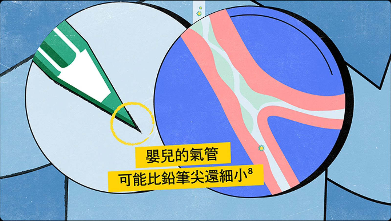 嬰兒出生的第一年,他們肺部的氣管非常細小和脆弱9 , 嬰兒的氣管可能比鉛筆尖還細小8 。